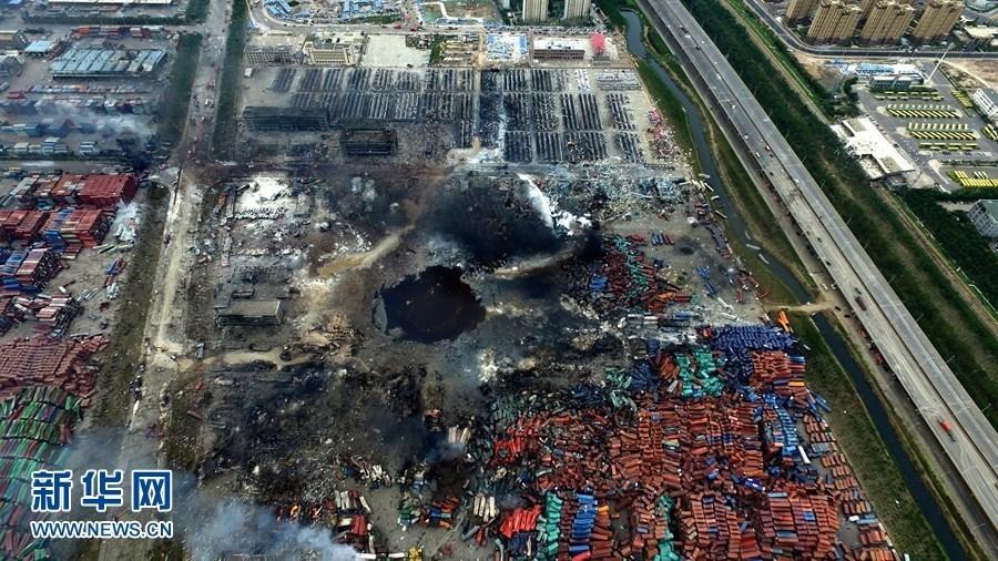 An aerial photograph taken on Aug 16, 2015 shows a huge hole at the center of the site of a series of explosions in North China’s Tianjin municipality. The hole is filled with dark water.(Photo/Xinhua)