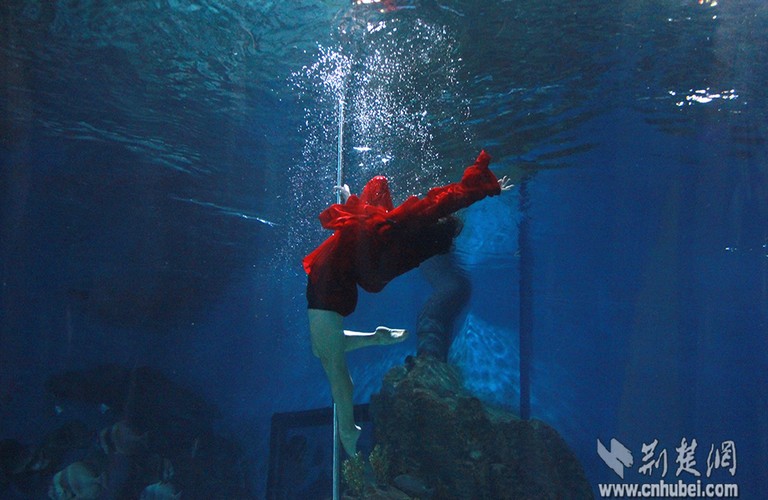 An underwater pole dance show is held at Wuhan Polar Ocean World, Aug. 14, 2015. The performer was Zhang Mingli, who is a polar dance instructor. She said it is much harder to perform pole dance under water since the pressure was difficult to control. (Photo/Cnhubei.com)
