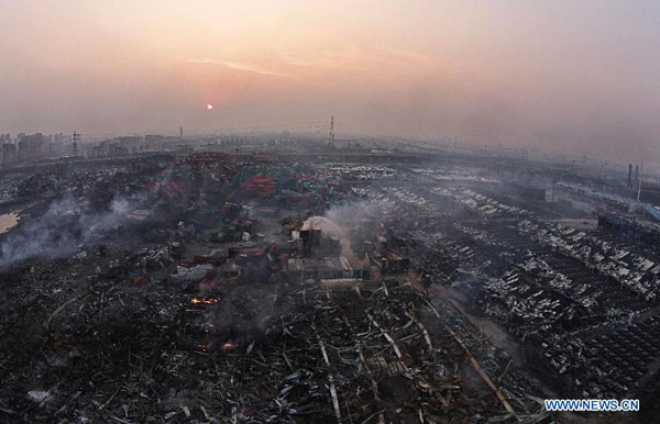 | Photo taken on Aug. 16, 2015 shows the warehouse explosion site in Tianjin. A total of 112 bodies have been found, and 95 people remained missing, including 85 firefighters, after massive warehouse explosions rocked north China's Tianjin city Wednesday night, officials said at a press conference Sunday morning. (Xinhua/Yue Yuewei) |