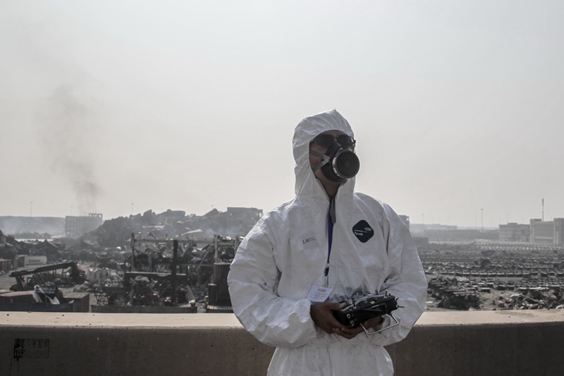 On Aug. 16, 2015, drones are used to survey the explosion site and nearby areas after the massive warehouse blasts in north China's Tianjin City last Wednesday. (Xinhua/ Zheng Huansong)