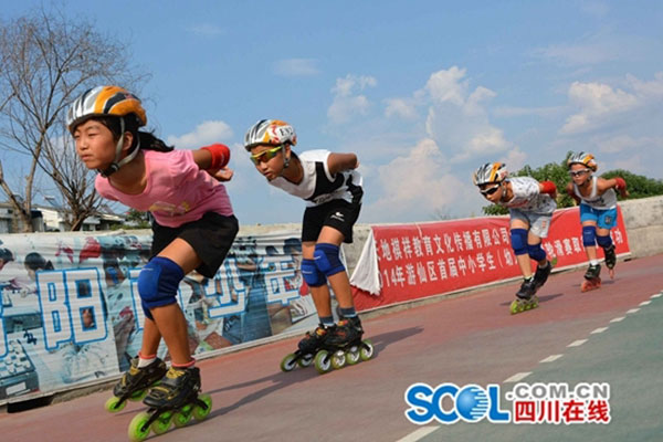 He Peicheng teaches a group of children to practice roller-skating in Mianyang city, southwest China's Sichuan province. (Photo/scol.com.cn)