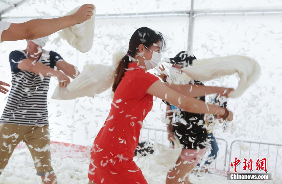 A pillow fight in Nanjing attracts many young people to participate in on Aug. 15, 2015. People chased each other and hit each other with pillows, releasing their pressure and making friends. (Chinanews/Yang Bo)