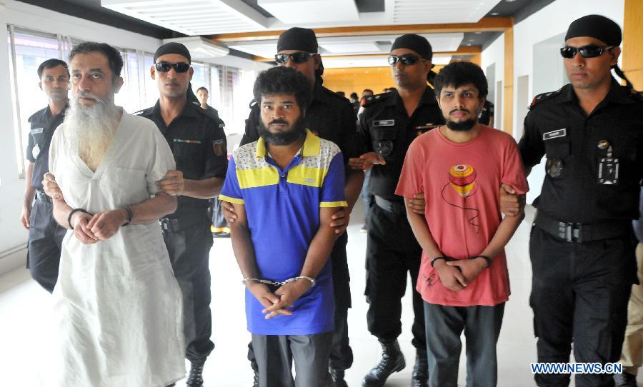 Three suspects of a murder case of Bangladeshi bloggers are arrested by Rapid Action Battalion (RAB) in Dhaka, capital of Bangladesh, on Aug. 18, 2015. Three suspects including a British citizen of an outlawed Islamist group, Ansarullah Bangla Team, have been arrested in connection with the murder of two Bangladeshi bloggers, Abhijit Roy and Ananta Bijoy. (Xinhua/Shariful Islam)