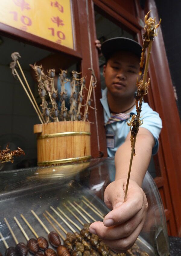 | A young vendor sells roasted scorpions on the streets of Beijing |