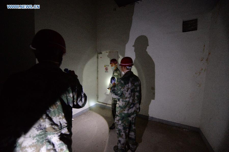 Militia check the underground space of a residential area near the warehouse explosion site in north China's Tianjin, Aug. 18, 2015. (Xinhua/Yin Dongxun)
