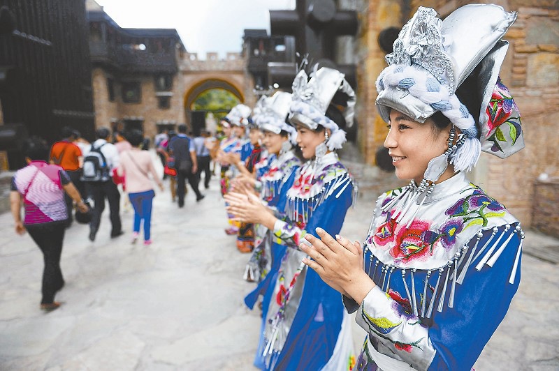 The twin sisters perform at the gate opening ceremony of Qiang ancient city. (Sichuan Daily/Li Xiangyu)
