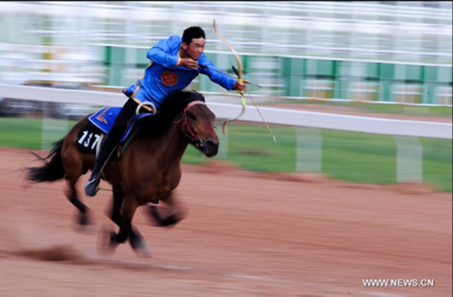 An athlete from southwest China's Tibet Autonomous Region performs horse racing and archery on Aug. 10, 2015. (Xinhua/Lian Zhen)