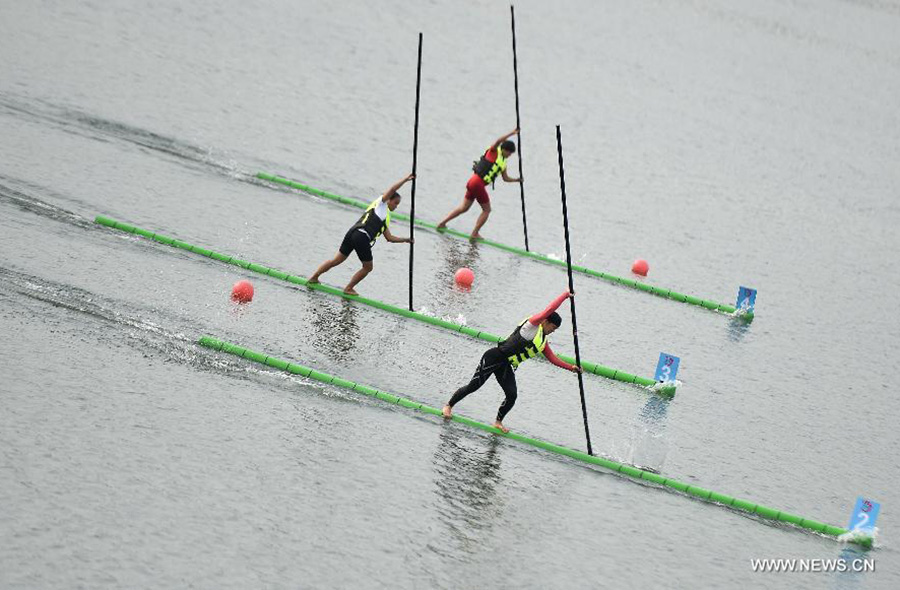 Athletes compete in a women's preliminary match of single bamboo drifting, a specialty in southwest China's Guizhou Province on Aug. 10, 2015. (Xinhua/Zhang Ailin)
