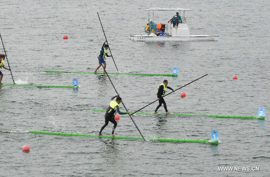 Athletes compete in a women's preliminary match of single bamboo drifting, a specialty in southwest China's Guizhou Province on Aug. 10, 2015. (Xinhua/Zhang Ailin)