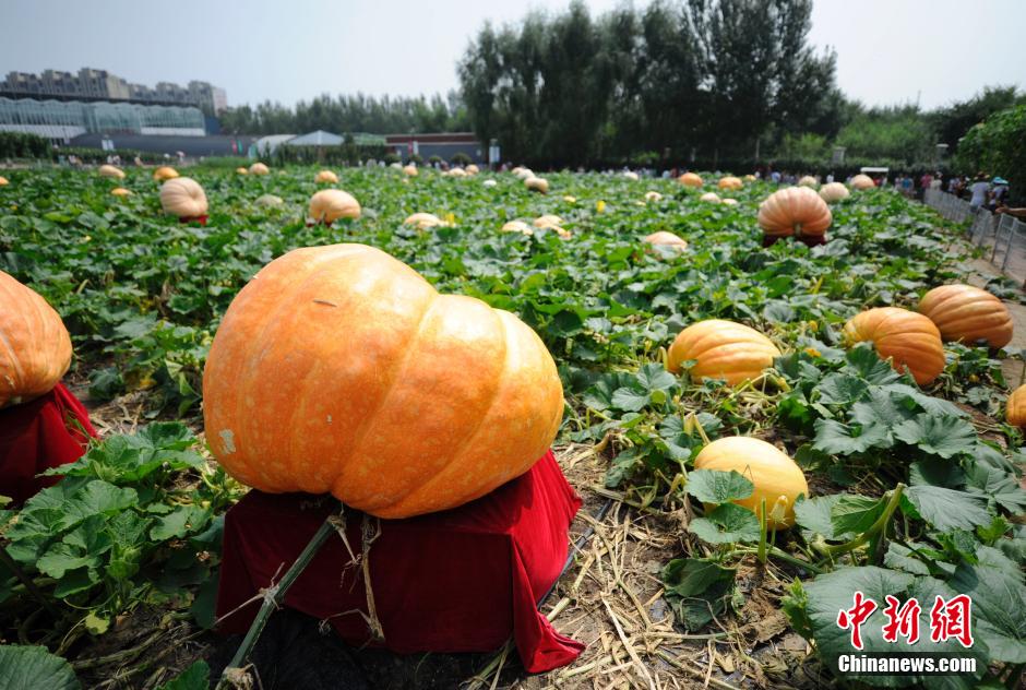 A 150 kg pumpkin is exhibited in the 14th Changchun Agricultural Expo Park in Changchun, capital of northeast China's Jilin province on Aug 17, 2015. The giant pumpkin which is not edible attracted many visitors. (CNS/ Zhang Yao)