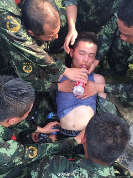 Lu Dongdong, a soldier in an anti-chemical warfare comapny of the Armed Police Force, falls into coma twice due to continuous working at Tianjin blast site on Aug. 17. The temperature inside the anti-chemical warfare suit exceeded 60 degrees Celsius. (Photo/official Weibo of CNTV)