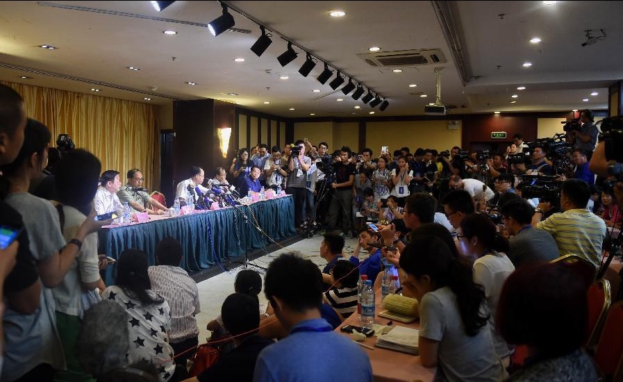 A press conference relate to the explosion at Binhai district was held in Tianjin, north China, Aug. 13, 2015.