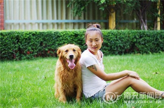Yue Xiaohong poses for a photo with the dog she trains. (cnncw.cn/ Xu Siqian)