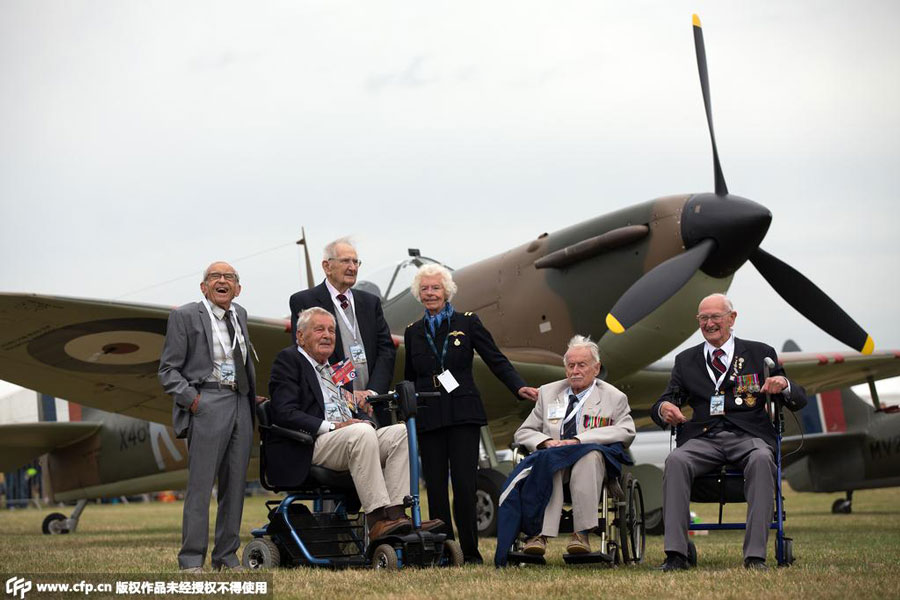 18 spitfires and 6 Hawker Hurricanes perform air show in southeastern England to commemorate the 75th anniversary of the Battle of Britain on Aug. 18, 2015. (Photo/CFP)