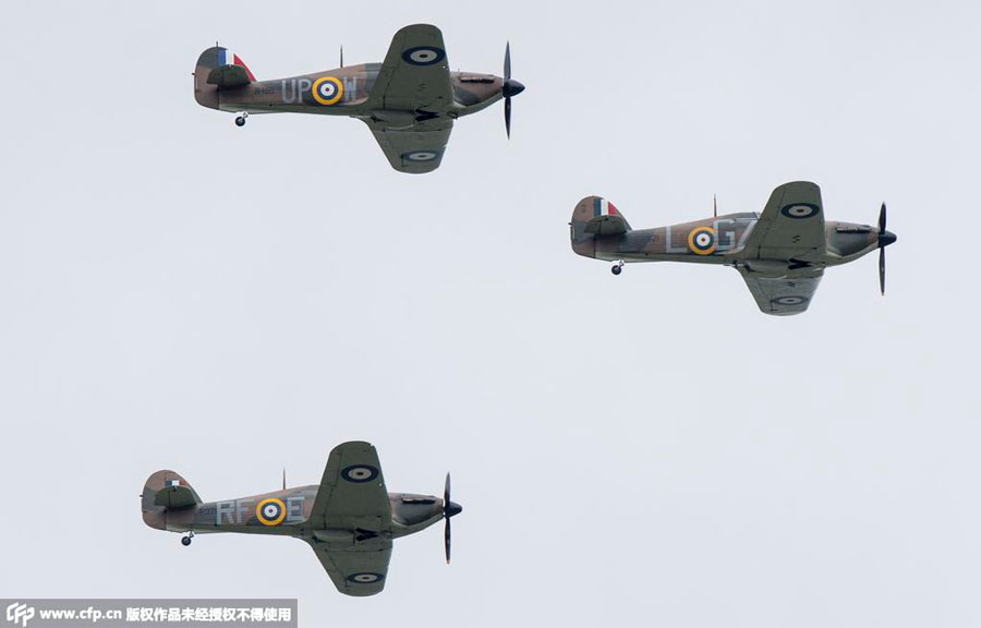 18 spitfires and 6 Hawker Hurricanes perform air show in southeastern England to commemorate the 75th anniversary of the Battle of Britain on Aug. 18, 2015. (Photo/CFP)