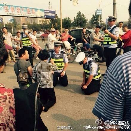 Two police and an old woman were seen kneeling down on a street in Handan city, Hebei Province on Friday. The old woman was crying and pleading frenziedly, as the police quietly knelt before her.