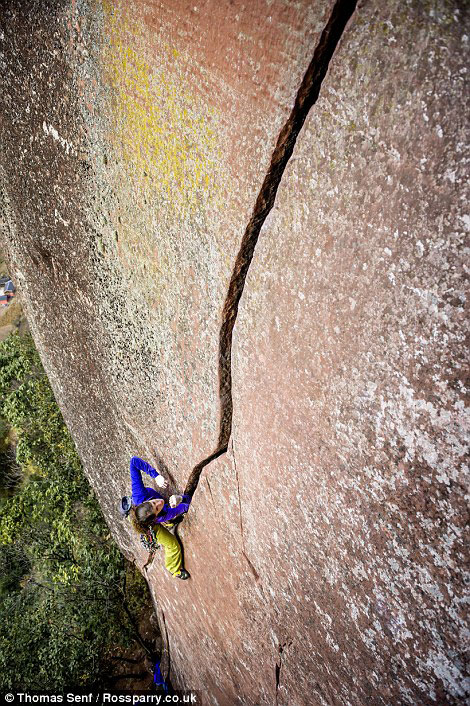 Ms Schelb used the cracks in the rock-face to haul herself up the vertical ascent, often having to widen holes along the way