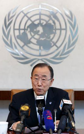 UN Secretary-General Ban Ki-moon meets the press at the UN headquarters August 28, 2015. Ban has highly commented on China's contribution to and sacrifice in World War II (WWII), shortly before China's Sept 3 parade to mark the 70th anniversary of its victory in the Anti-Japanese War. [Photo/Xinhua]