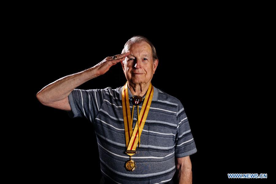 Photo taken on Sept.2, 2015 shows the image of J.V. Vinyard, in Beijing, capital of China. J.V. Vinyard is a former U.S. pilot who participated in more than 600 hours of operational flights in transport aircraft on the dangerous and difficult Assam-Bengal-China Air Routes during the WWII, carrying goods and materials to China. Chinese President Xi Jinping on Wednesday granted medals to 10 international anti-fascist fighters who fought for China in World War II.(Xinhua/Liu Jinhai)