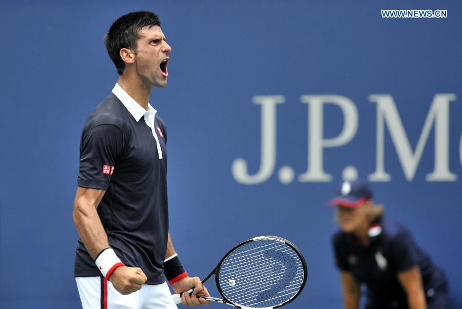 Novak Djokovic of Serbia celebrates during the men's singles third round match against Andreas Seppi of Italy at the 2015 US Open in New York, the United States, Sept. 4, 2015. Novak Djokovic won 3-0 to enter the next round. (Xinhua/Wang Lei)