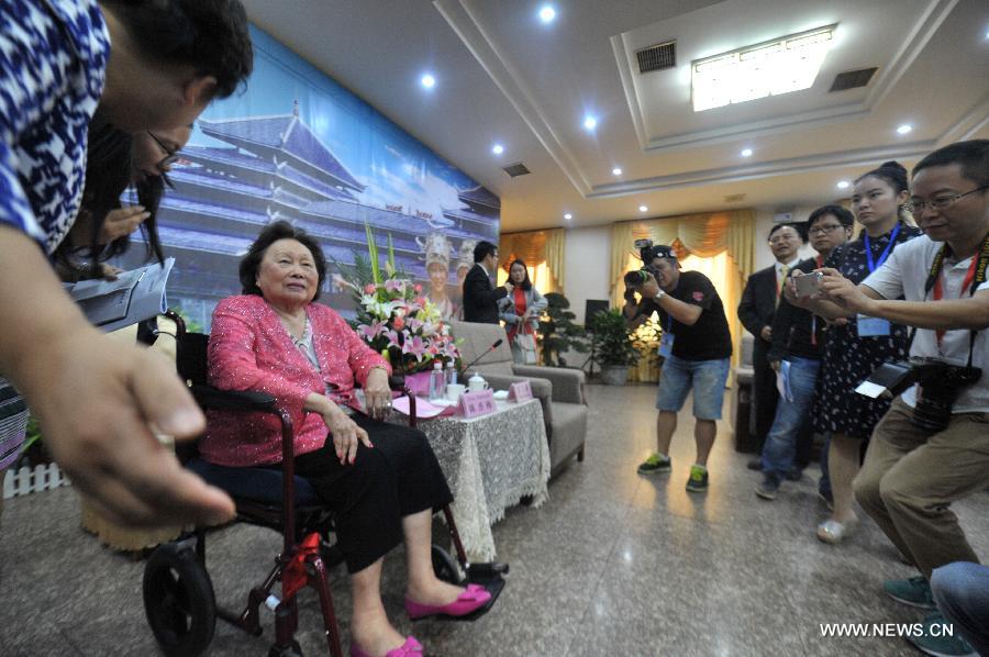 Anna Chan Chennault, wife of American pilot Claire Chennault, who volunteered to fight against the Japanese air force during the World War II, receives an interview in Zhijiang, central China's Hunan Province, Sept. 4, 2015. Anna Chan Chennault arrived in Zhijiang on Friday afternoon and will visit the Flying Tigers Memorial. (Xinhua/Long Hongtao)