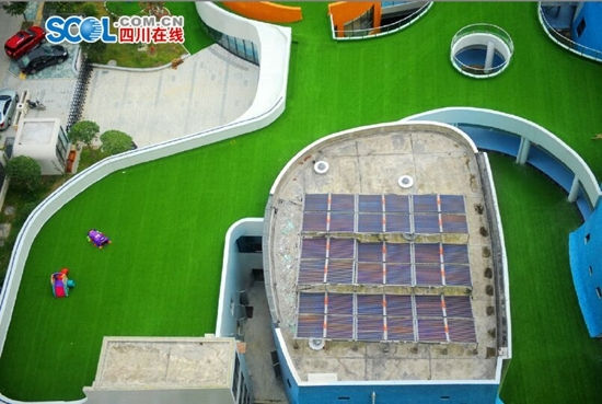 Overlooking the kindergarten, a large number of solar energy equipment can be seen on the roofs of the buildings.(Photo/scol.com.cn)