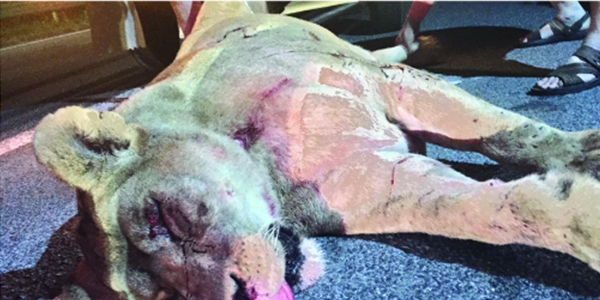 A lion hit by a car walked towards a service area on an expressway in east China's Jiangsu province in the evening. Having rest, dining and refueling their cars, people in the service area did not expect a beast is around the corner.