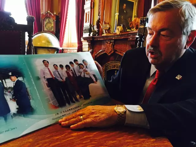 DeWayne Hopkins, the mayor of Muscatine, attended the gathering at Lande's house after returning from a visit to China, saying a Muscatine-themed cultural center has been completed in Jinan, East China's Shandong Province to display the history and life in central US.