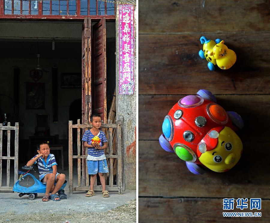 Left picture: Shen Lang (left), 8, plays with his brother, Shen Tao, 7, in front of their house.