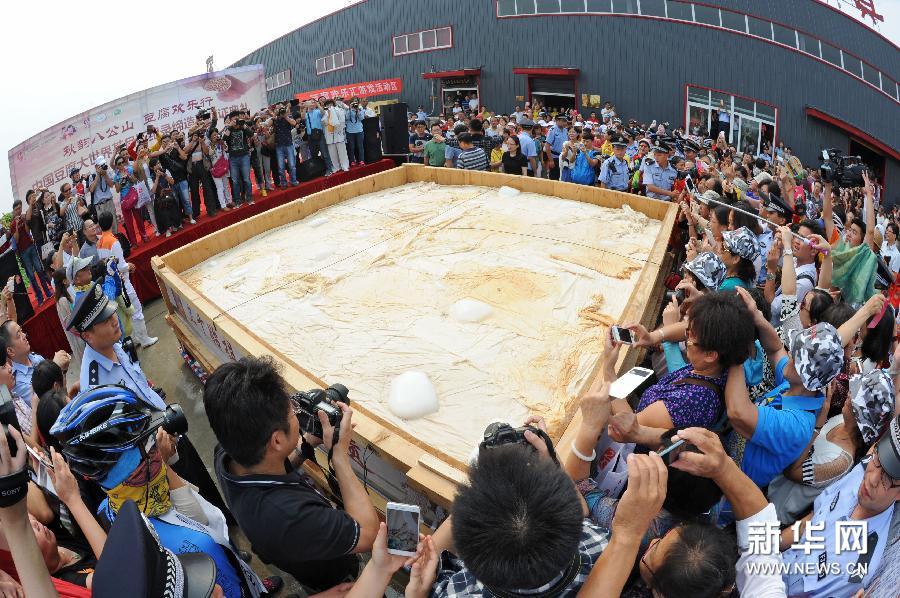 The largest piece of tofu attracted a lot of attention at the Anhui Huainan tofu festival on Sept. 15, 2015. Over 50 people spent 7 hours working on this piece of tofu which was 3.64 meters long, 3.62 meter wide and 0.4 meters high. (Photo/Xinhua)