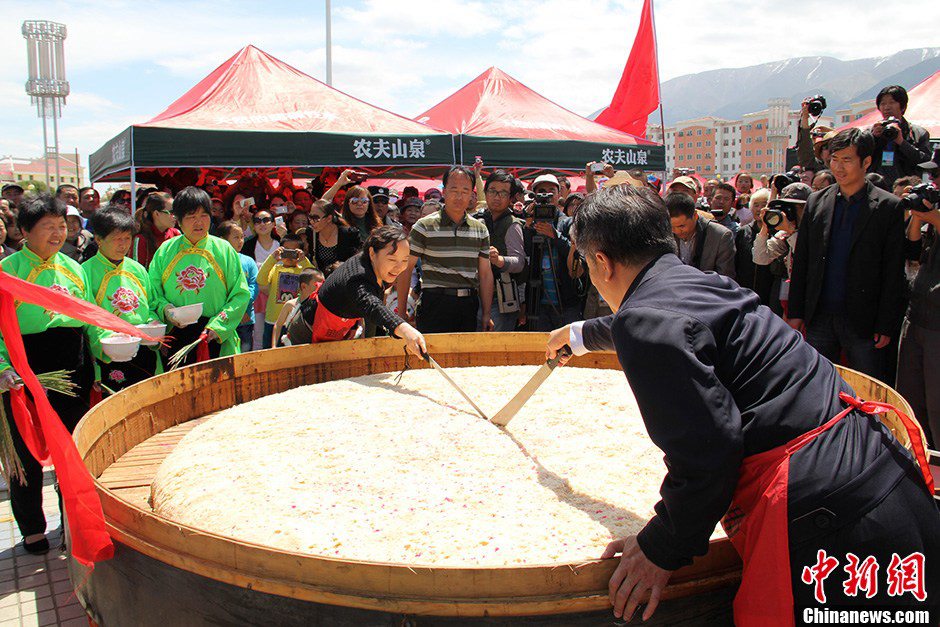 20 cooks from Balikun Kazakh Autonomous County, Xinjiang spent 5 hours making a 500-kilogram steamed cake with a diameter of 2.6 meters on June 12, 2013. (Qi Yaping/Chinanews)