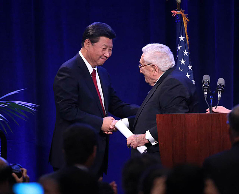 Chinese President Xi Jinping(L) shakes hands with Henry Alfred Kissinger(R)during a welcome banquet jointly hosted by Washington State government and friendly communities in Seattle, the United States, Sept. 22, 2015. Xi arrived in this east Pacific coast city on Tuesday morning for his first state visit to the U.S.