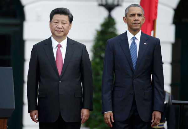 US President Barack Obama (R) stands with Chinese President Xi Jinping as he welcomes him at the White House for an official State Visit in Washington September 25, 2015.[Photo/Agencies]
