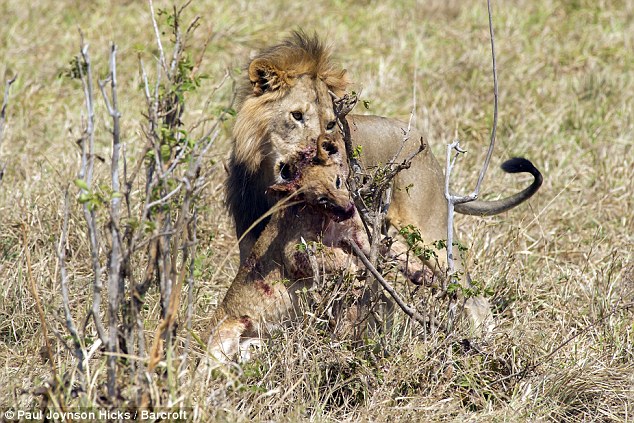 The powerful big cat was spotted by photographers who thought they were watching a mating couple in Tarangire National Park in Tanzania but were shocked to see a lion's paw flick up above the long grass as he devoured a meal.