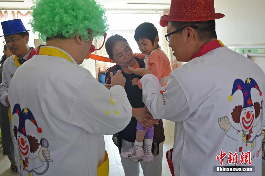 Volunteers dress up as different cartoon characters to please child patients at a hospital in Taiyuan, north China's Shanxi Province, on September 26, 2015. These "clown doctors" communicated and played with kids to help take their minds off their illnesses. [Photo: chinanews.com]