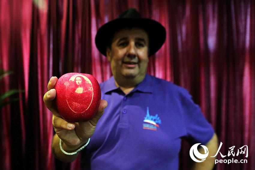 Pascal shows the apple with Mono Lisa portrait on its skin. (Photo/people.cn)