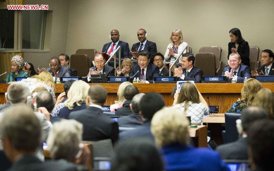 Chinese President Xi Jinping delivers a speech at the Global Leaders' Meeting on Gender Equality and Women's Empowerment at the United Nations headquarters in New York, the United States, Sept. 27, 2015. (Xinhua/Huang Jingwen)