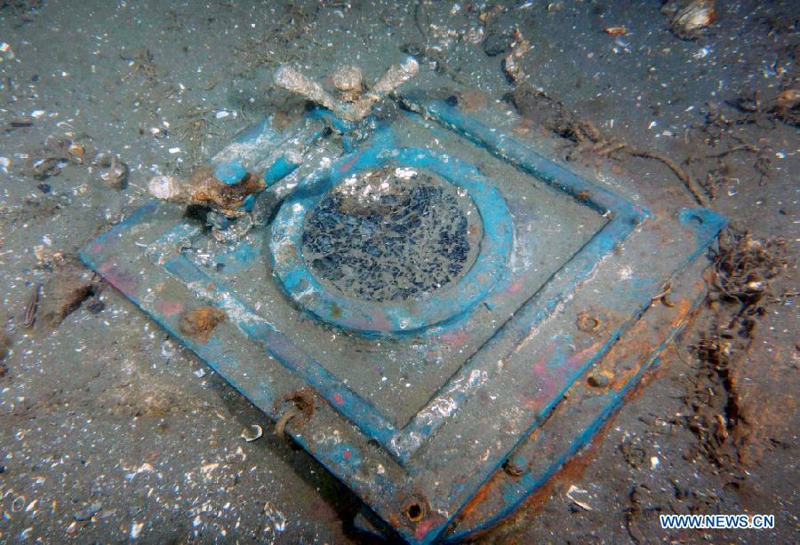 Photo taken on Sept. 25, 2015 shows a porthole from "Dandong No.1", a shipwreck discovered last year near Dandong Port, northeast China's Liaoning Province. An archeological team from the National Center of Underwater Cultural Heritage have salvaged more than 100 items from the wreck during the past two months. They confirmed "Dandong No.1" as cruiser Zhiyuan, one of the warships of the Beiyang Fleet sunk by the Japanese navy during the first Sino-Japanese War 121 years ago. (Photo/Xinhua)