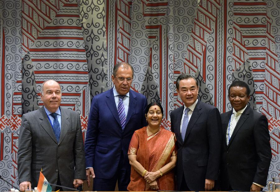 (L to R) Brazilian Minister of External Relations Mauro Luiz Iecker Vieira, Russian Foreign Minister Sergei Lavrov, Indian External Affairs Minister Sushma Swaraj, Chinese Foreign Minister Wang Yi and South African Department of International Relations and Cooperation Director-General Jerry Matjila attend a meeting of BRICS foreign ministers in New York, the United States, Sept. 29, 2015. (Xinhua/Yin Bogu)