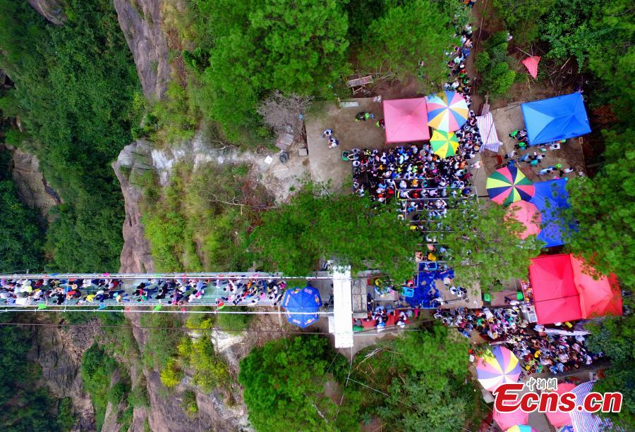 A photo taken on October 4, 2015 shows thousands of people on and near the all-glass bridge, which is located in Pingjiang County, in Central China's Hunan province. The all-glass bridge is suspended 180 meters over a canyon. It received around 20,000 visitors on last Friday, the second day of China's current week-long National Day holiday. (Photo: Chinanews.com/Liu Hongqiang)