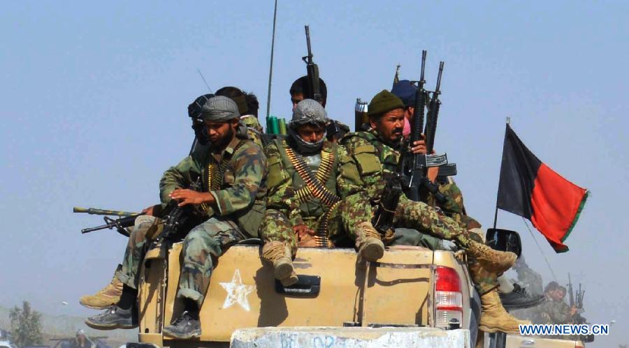 Afghan army soldiers sit on a military vehicle in Kunduz, Afghanistan, Oct. 5, 2015. Afghan security forces after five days of fierce fighting evicted Taliban militants from the northern Kunduz city and after pulling down Taliban white flags from each part of the city hoisted government three-colored flag on the top of Provincial Governor House on Monday. [Photo: Xinhua/Ajmal]