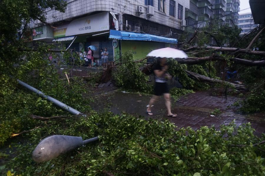 A person passes by fallen trees uprooted by strong winds from typhoon Mujigae in Zhanjiang city, south China's Guangdong Province, Oct. 4, 2015. (Xinhua/Wu Lu)