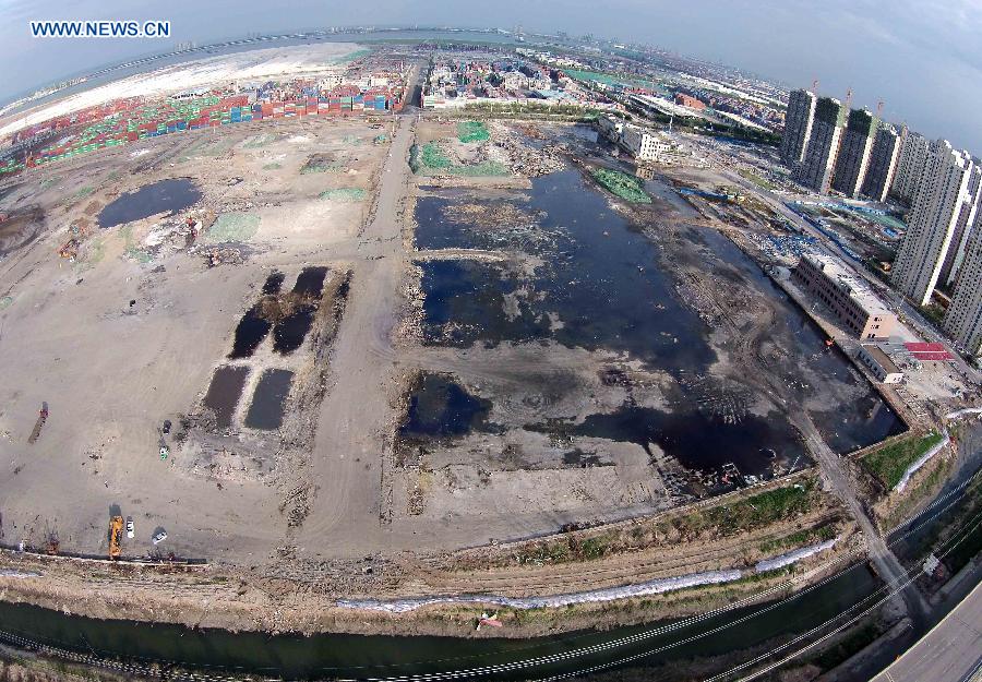 Photo taken on Sept. 11, 2015 shows an aerial view of the warehouse blast site in Binhai New Area of north China's Tianjin Municipality. The death toll from the massive Tianjin warehouse blasts rose to 165 after remains of one more firefighter were identified, according to authorities on Friday. Two blasts ripped through a warehouse at around 11:30 p.m. on Aug. 12 in Tianjin Port, where large amounts of toxic chemicals were stored, including around 700 tonnes of sodium cyanide. (Xinhua/Yue Yuewei)