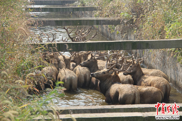 A total of 32 wild elks are trapped in a canal in Yancheng, east China's Jiangsu province on Oct. 14, 2015. (Photo/cyol.com)