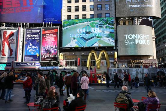 A publicity video for 2015 World Crowdfunding Conference held in southwest China’s Guiyang is shown in Times Square, New York City.