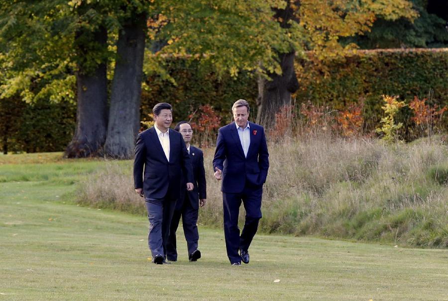 Chinese President Xi Jinping and British Prime Minister David Cameron take a walk at the latter's country retreat, Chequers, Britain, Oct. 22, 2015.(Xinhua/Ju Peng)
