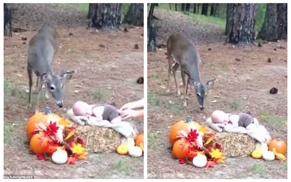 A newborn baby’s first photoshoot took an unexpected turn when a local deer moseyed out of the woods and made a cameo appearance in the one-month-old infant’s portraits.