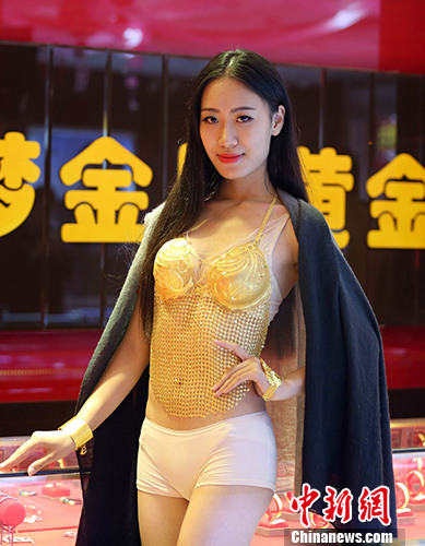 A model wears underwear made of gold in a shop in Jiujiang, east China's Jiangxi province on Oct. 31. (Photo/CNS)