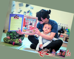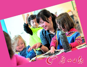 Children play games with Chinese-speaking staff and look at the shadow puppet patterns at the Hatching Dragon nursery.(Guangzhou Daily)