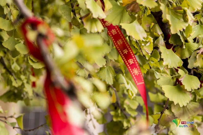 The red silk tied on the millennium ginkgo tree is covered with good wishes written by tourists. (Youth.cn/Sun Zhao)